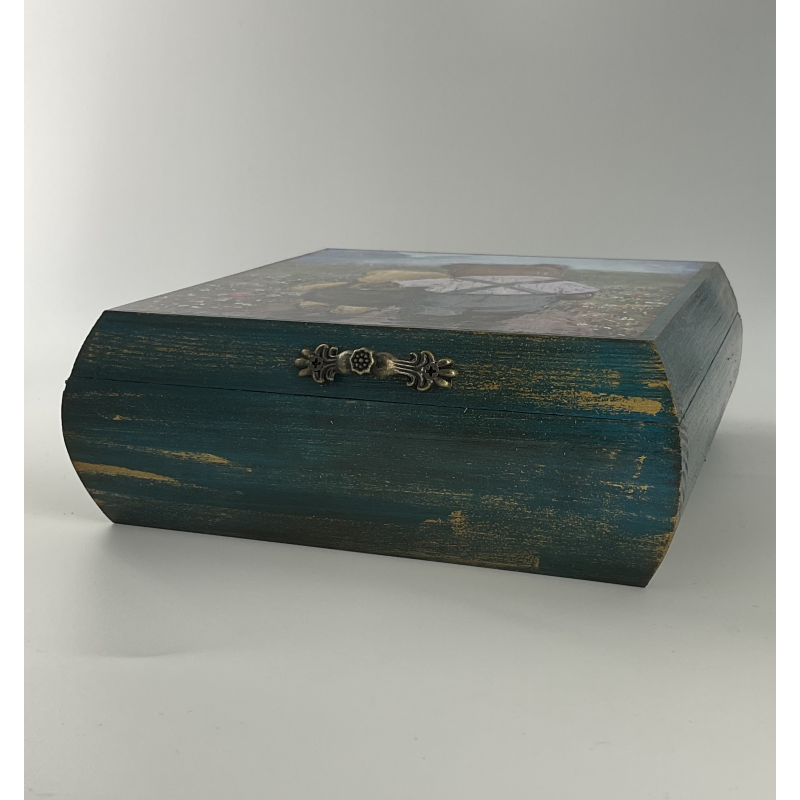Masivní dřevěná krabička se zaoblenými boky a úchytkou na různé drobnosti jako šperky, gumičky, tajnosti a jiné drobnosti. Zdobená technikou decoupage, dozdobováno patinou. Vše řádně zalakováno vodou ředitelným lakem, lze otírat vlhkým hadrem. Rozměry: 16x16x6 cm Barvy na obrázku se mohou lišit od reality. Prodávám na trzích i jiných webových stránkách. Tak se může stát, že zboží bude nedostupné. Vše je originální ruční práce.